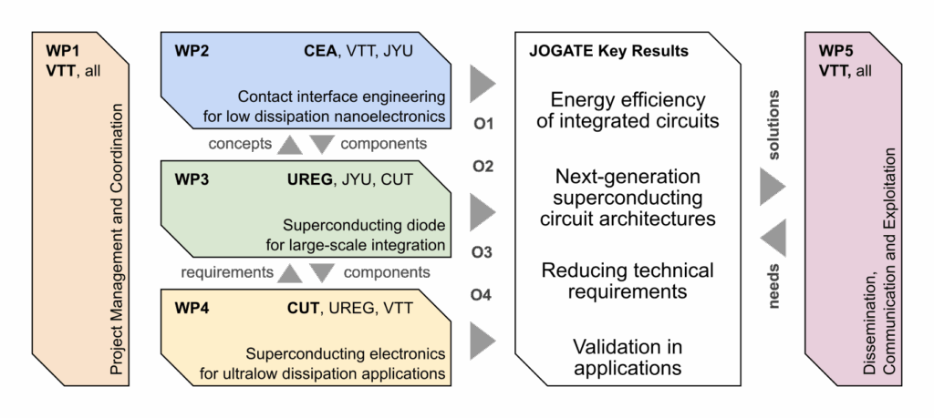In JOGATE we wish to study superconducting transistors and diodes and to upgrade their fabrication processes to be compatible with the methods of large-scale integration, making it possible for Europe to lead their industrial production. In parallel, we contribute to finding ways of improving their performance, to ease practical adoption and impact in areas ranging from cryogenic electronics to demanding environments such as space applications. Finally, to demonstrate the value of the technology and to deliver important outcomes in the short-term, we develop two prototype devices for cryogenic microwave signal management: a radiofrequency switch and an integrated superconducting qubit control chip.
